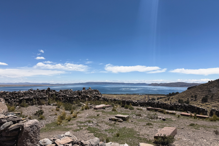 No dia seguinte partimos rumo ao Inca Tunuhuiri, um dos espaços mais enigmáticos e menos conhecidos da região. Localizado próximo do povoado de Ichu, este centro cerimonial pré-inca apresenta uma vista impressionante do lago Titicaca, que se estende diante de nós como um espelho azul entre as montanhas. O sítio arqueológico preserva muros de pedra arenisca, blocos antropomorfos e terraços que sugerem sua relevância ritual. Embora suas origens remontem à cultura Pucará (500 a.C.–400 d.C.), sabe-se que foi posteriormente reutilizado pelos incas. Ainda hoje, moradores locais realizam suas oferendas à Pachamama e aos apus, mantendo vivo seu legado místico.