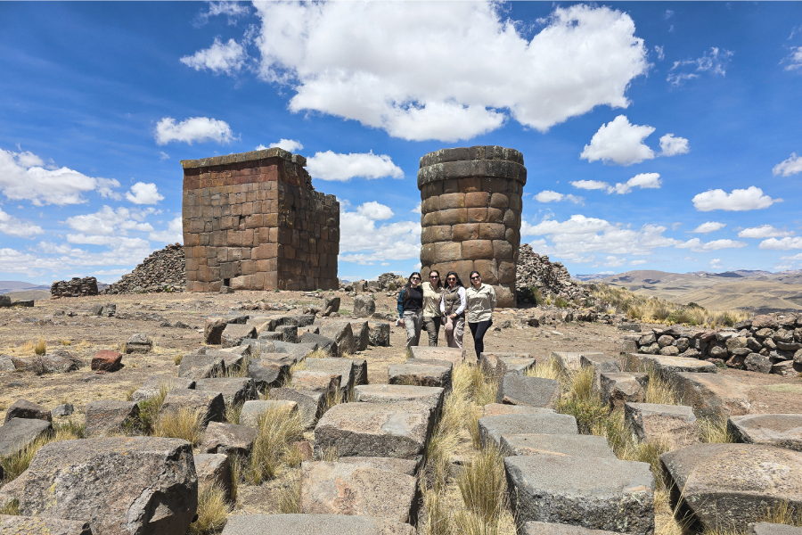 A caminhada até o topo, de cerca de 25 minutos, acontece entre queñuas (Polylepis spp.), árvores nativas dos Andes conhecidas por crescer em grandes altitudes — entre 3500 e 5000 metros — e cujos troncos se desprendem em finas lâminas, como se a paisagem também quisesse contar sua própria memória. Ao chegar ao planalto, a vista é realmente surpreendente: grandes chullpas esculpidas com precisão se erguem e dominam uma paisagem de montanhas e céu azul. A energia poderosa do lugar, perceptível desde o primeiro momento, é reforçada pela magnitude arquitetônica dessas criptas e por sua conexão com as culturas pré-hispânicas.